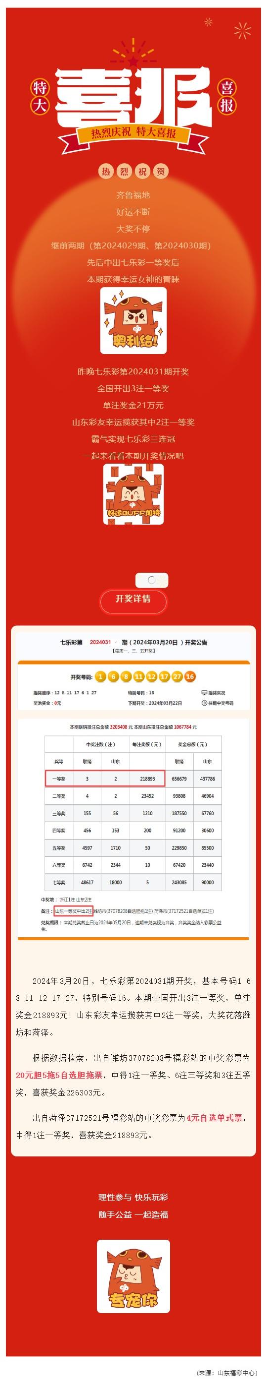 【喜報(bào)】三連冠!山東再獲2注七樂(lè)彩一等獎(jiǎng)!