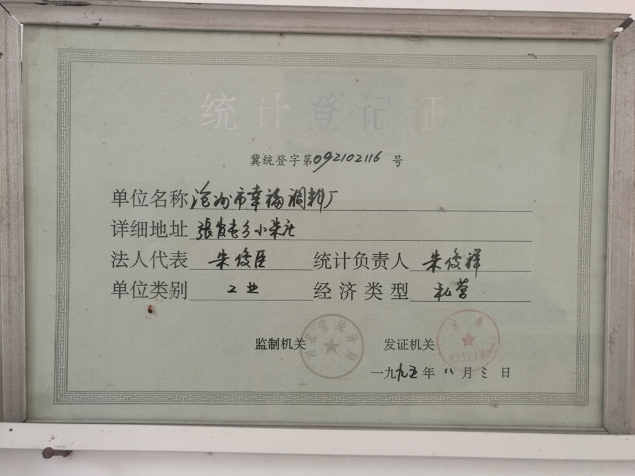 統(tǒng)計(jì)登記證 冀統(tǒng)登字第092102116號(hào) 單位名稱滄州市幸福調(diào)料廠 詳細(xì)地址張官屯鄉(xiāng)小朱莊 發(fā)證機(jī)關(guān):滄縣統(tǒng)計(jì)局 監(jiān)制機(jī)關(guān):河北省統(tǒng)計(jì)局 一九九五年八月三日