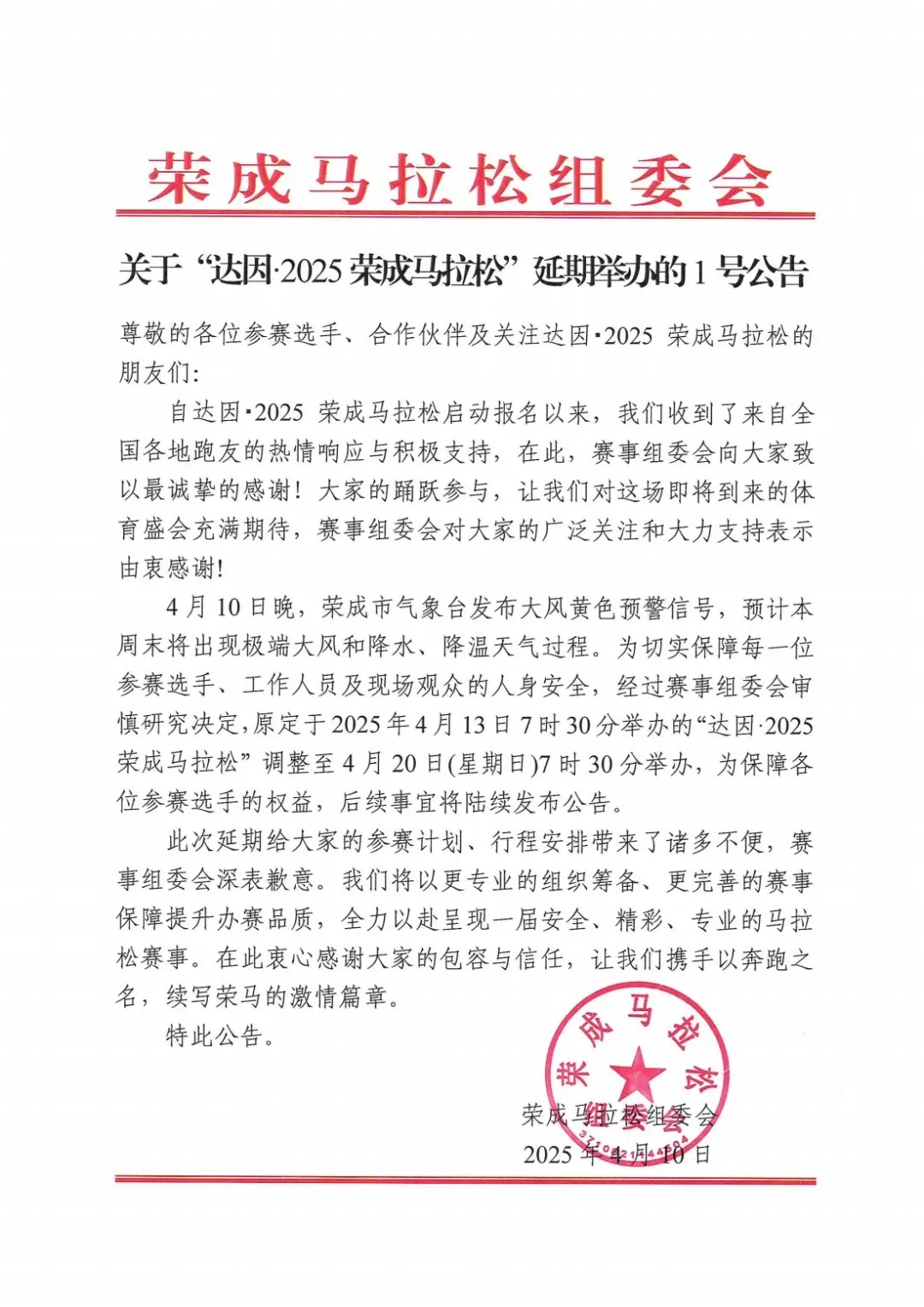 延期至4月20日,關(guān)于“達(dá)因·2025榮成馬拉松”延期舉辦的1號(hào)公告