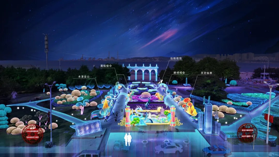 高區(qū)在高新廣場(chǎng)布置一組“山海畫卷”立體景觀,主體造型以卷軸為本,以海洋文化為題材,融入海洋動(dòng)植物、浪花、祥云、海鷗等元素。廣場(chǎng)四周樹木、草坪上采取紅燈籠、水母燈、詩詞燈柱、網(wǎng)燈等燈飾和“毛衣樹”裝飾進(jìn)行全方位裝點(diǎn),達(dá)到晝夜皆景。同時(shí),在世昌大道、文化路、環(huán)海路、火炬八街等重要路段和重要節(jié)點(diǎn)的行道樹上懸掛燈籠,綠地里布置燈飾。
