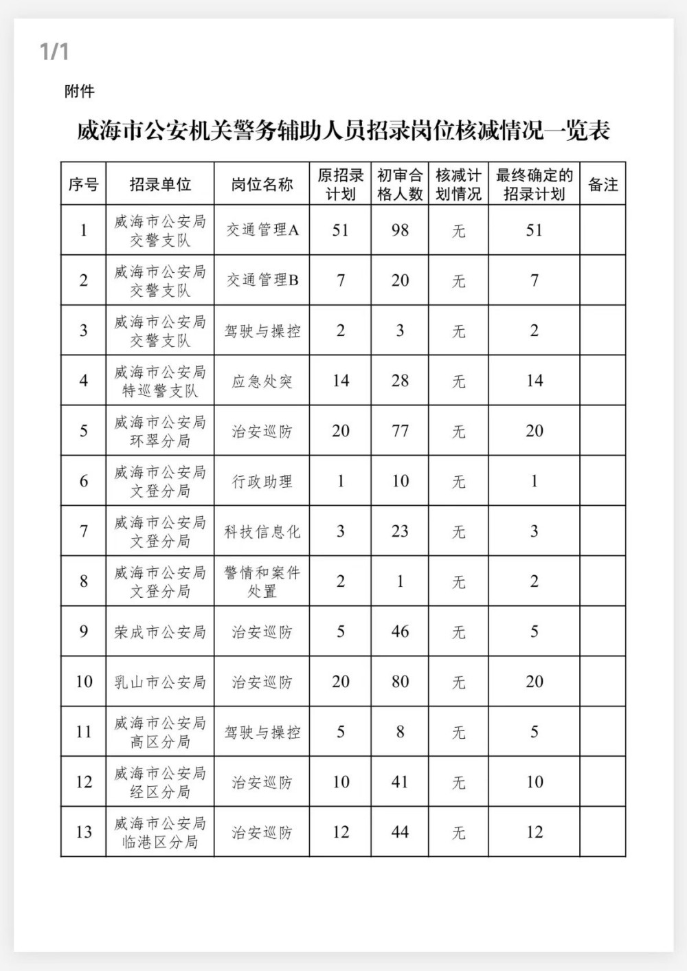 附件:威海市公安機(jī)關(guān)警務(wù)輔助人員招錄崗位核減情況一覽表